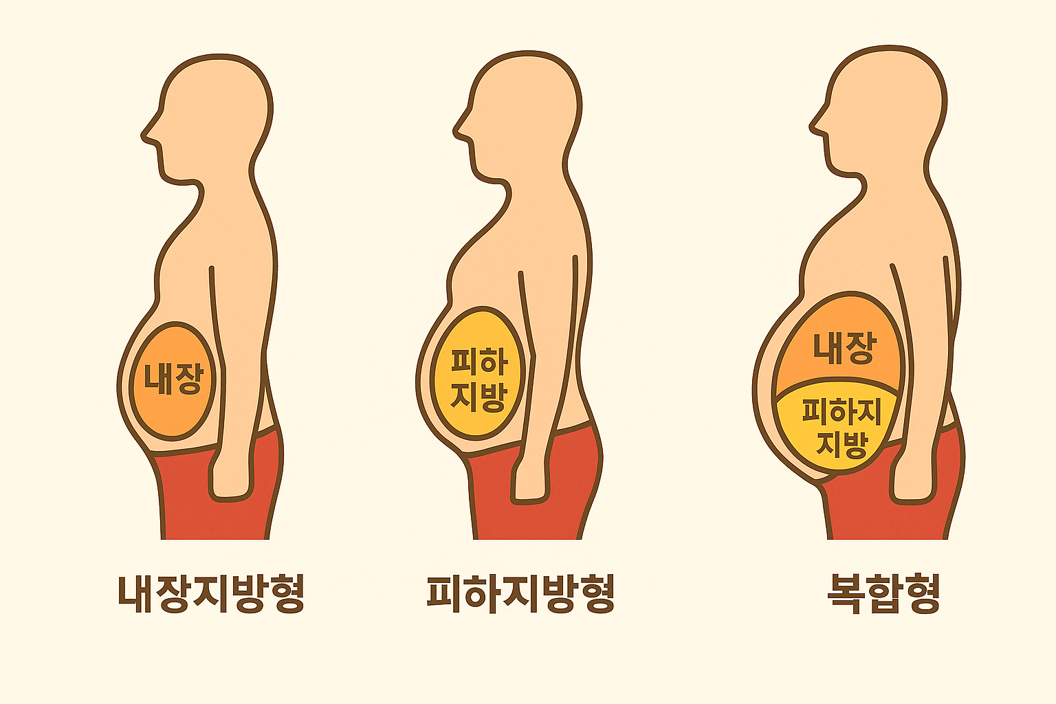 - 피하지방형 (아랫배 비만): 피부 아래 지방층 축적으로, 외형 변화와 관절 통증은 유발하지만 대사 위험은 상대적으로 낮음